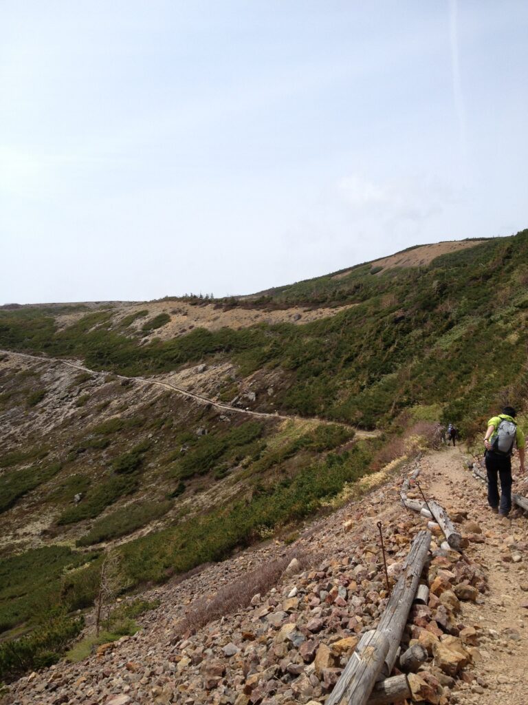 少し登ると、木が増えてきて樹林帯へ入ります。1時間半ほど登り、扇雪渓で休憩をとりつつ高度をあげていくと丸山ケルンに到着します。標高2500mを過ぎたあたりから、森林限界を超え、視界が開けてきます。